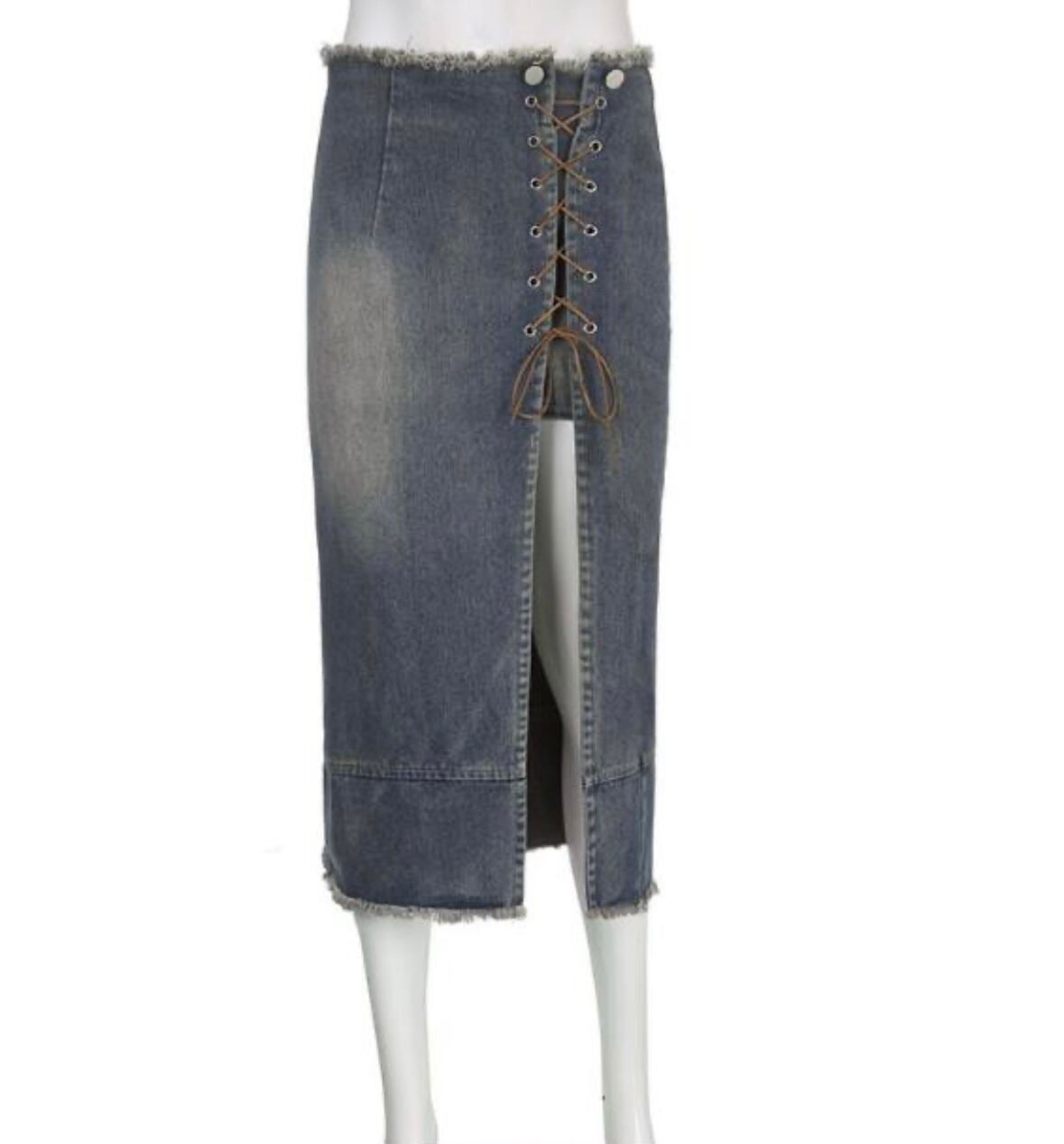 刺繍入りデニムドレス★デニムスカート タイトスカート 膝下丈 スリット スカート