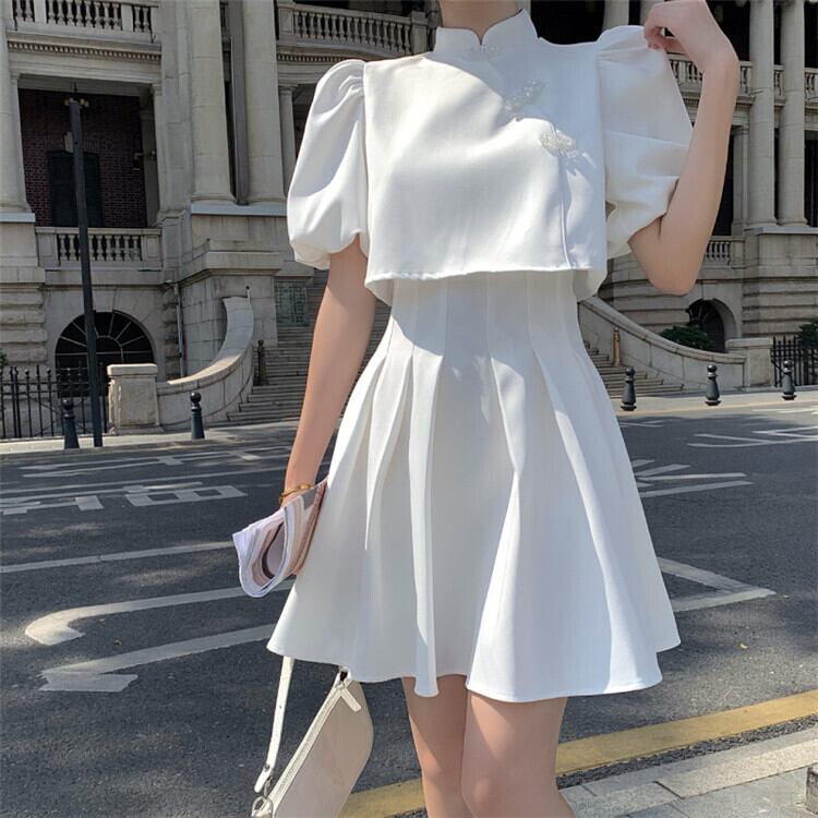ギャザリング カジュアル 百掛け ホワイト チャイナドレス 短いスタイル トップス ハイウエスト