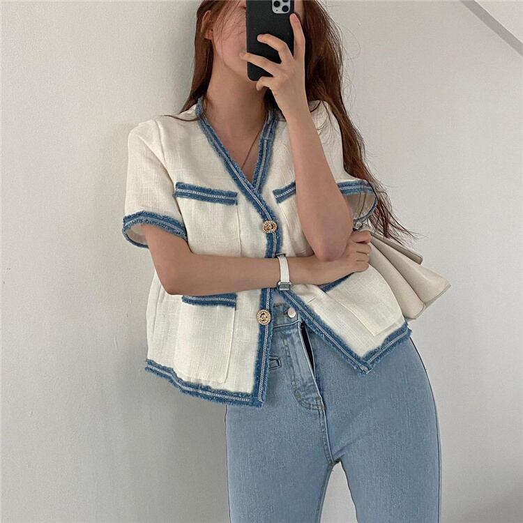 レトロ 気質 カラーマッチング 半袖 ボタン マルチポケット コート sweet系 百掛け