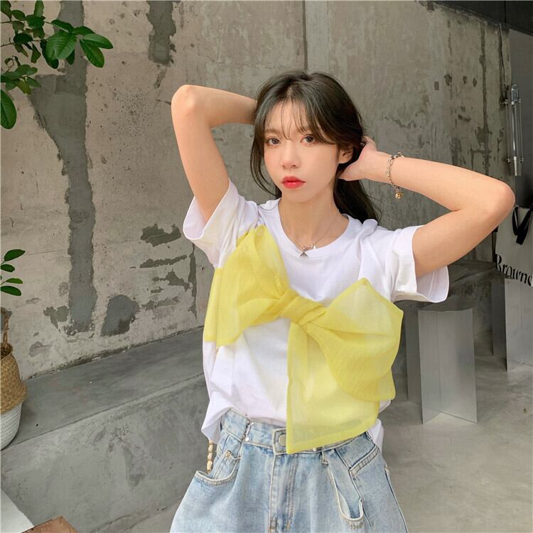 着るだけでシーズンムードが上がる 韓国版 ラウンドネック 半袖 蝶結び Tシャツ カジュアル 百掛け 減齢