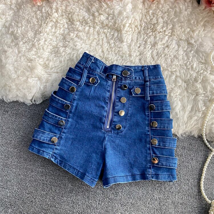 低調なぜいたく感 レトロボタン 百掛け ハイウエスト バッグヒップ スリムフィット デニムショートパンツ