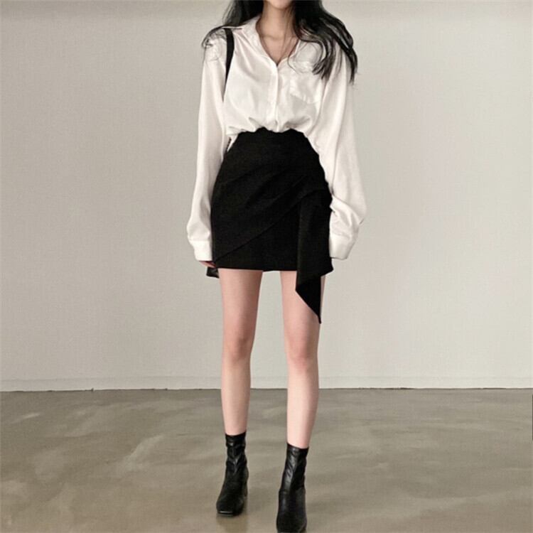 こなれ感たっぷりの大人スタイル 韓国ファッション カジュアル 怠惰な風 シャツ ギャザリング