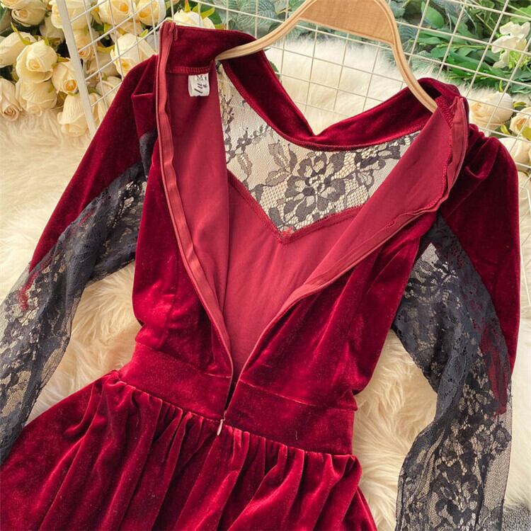 INSスタイル 洗練された 遠近法 レース 長袖 縫付 レトロ ベルベット スプリット 百掛け ワンビース